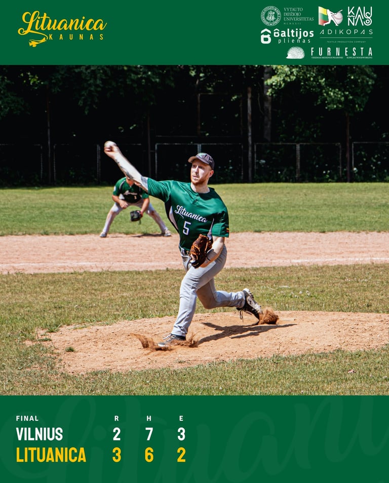Tvirtą gynybą demonstravusi Kauno „Lituanica“ (9–1) dviem pergalėmis užbaigė pirmąjį Lietuvos beisbolo čempionato ratą, kai šeštadienį Vilniuje rezultatais 3:2 ir 10:6 nugalėjo BK „Vilnius“ (8–2) beisbolininkus.